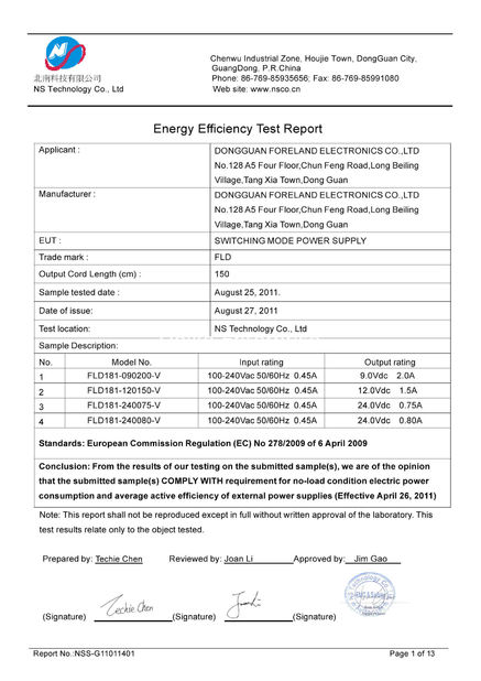 Standard:ERP Certificate Number:NSS-G1101401 Issue Date:2011-08-25 Expiry Date:2015-08-25 Scope/Range:power supply Issued By:NS Tecnology |