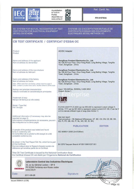 Standard:CB report Number:FR 615783A Issue Date:2011-08-30 Expiry Date:2016-08-30 Scope/Range:power supply Issued By:IEC |